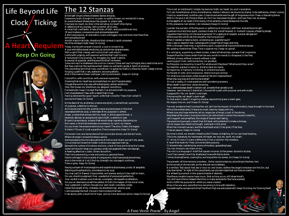 Join the vibe: follow Angel’s journey, share the message, and let the poem spark your own purpose. This poem explores twilight, faith, resilience, love, and the paradox of time, moving from shadow to hope. It confronts masks, family, judgment, and a yearning for a legacy of compassion, especially for Africa and social welfare. Key themes: authentic spirit, “life beyond this life,” forgiveness, the Requiem paradox, hope, transformation, and the drive to make an impact. The refrain “Keep On Going!” urges us to keep pushing — as long as you still draw breath, keep going on regardless of the circumstances, even when facing depression, trauma, or any dark moment, refuse to surrender to death.